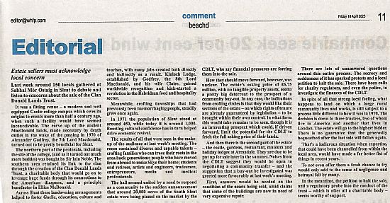 West Highland Free Press cuttings - April Please accept our apologies for the quality of presentation. We hope quantity makes up for quality. Hopefully readers will be able to achieve a reasonable quality of zoom on their screen.
